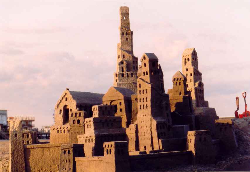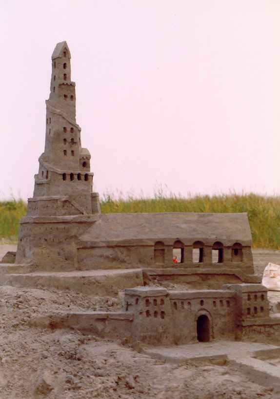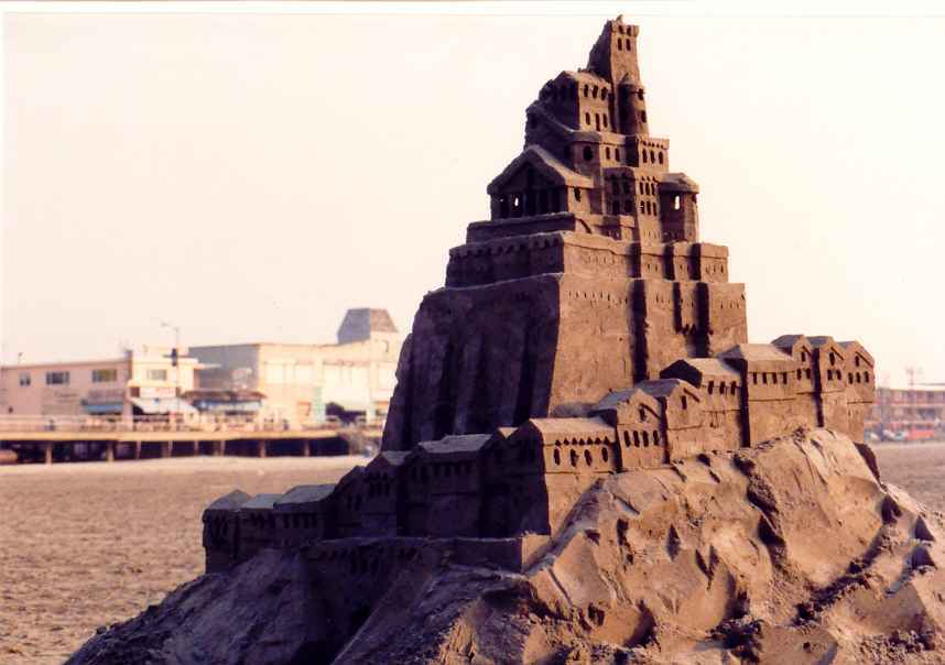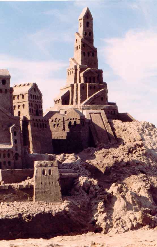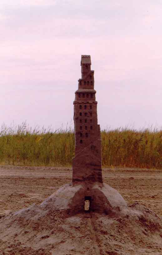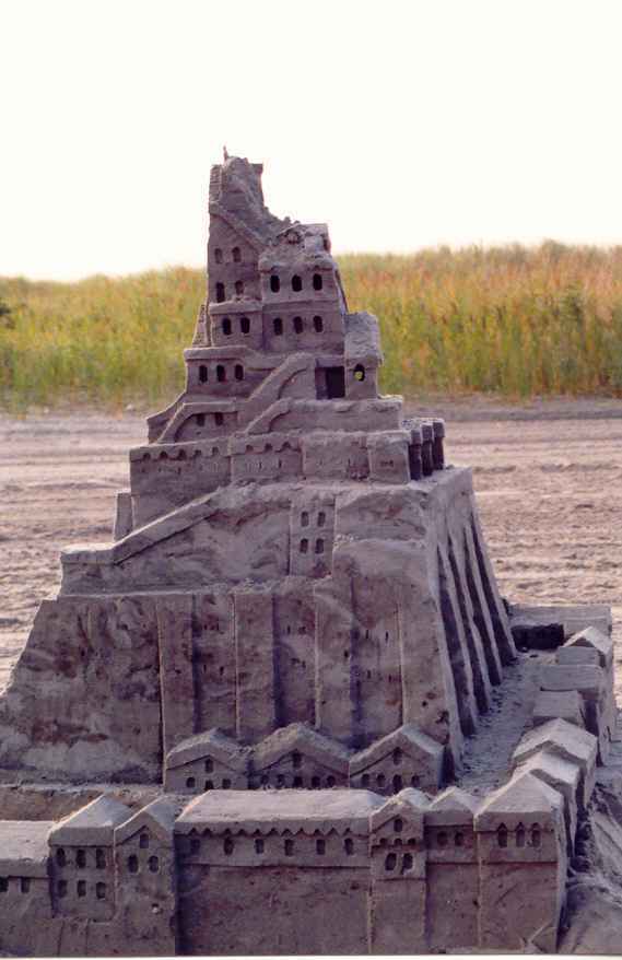 In 1998, we arrived at the beach in the middle of a Sunday afternoon. Not wanting to waste even a partial day at the beach, I built one tower, maybe 3 feet tall. The doorway cut all the way through the base was an afterthought, and doesn't add much to the tower's appearance. It does illustrate the fact that you only need to leave "just enough" sand to support the tower. If you want the illustration of what happens when you take away one scoop too much, just imagine a pile of sand. I don't take pictures of those....