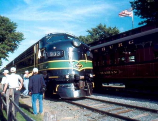 ![]() Here's an unusual visitor at Strasburg. This Reading Railroad FP-7, and number 900, have been restored by the National Railway Historical Society and the Reading Company Technical & Historical Society. These locomotives were visiting Strasburg with a train full of "railfans" (railroad fans) from Philadelphia. Yes, the webmaster was one of them! ;-) |